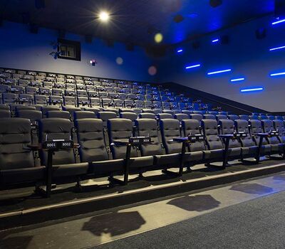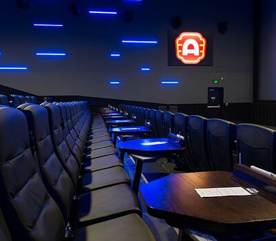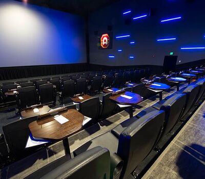 This cinema was built with eight theatres and installed with a custom Signature Rocker and table developed specifically for Alamo Drafthouse Cinemas. The seating is provided with black plastic and powder coat and CMI Illusion vinyl for easy cleaning and a luxurious feel. Chairs feature flip-up cupholder armrests and the tables are manufactured with concealed lights, menu holders, purse hooks and seat number identification block with pen holder.