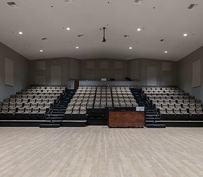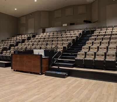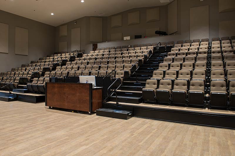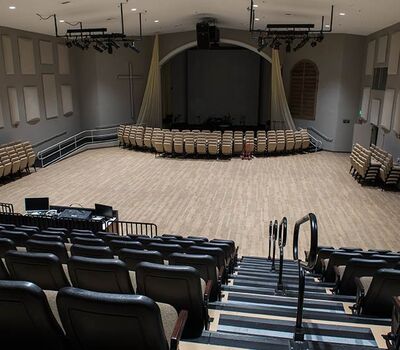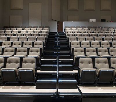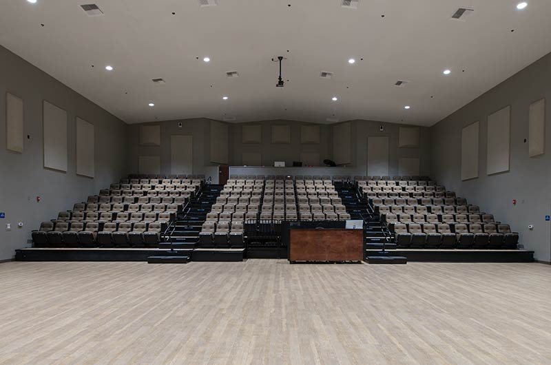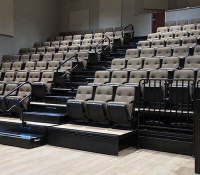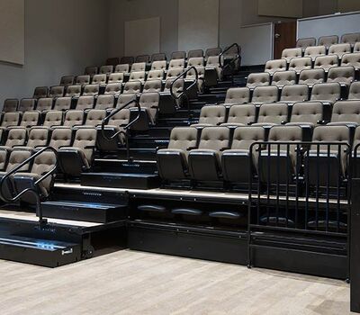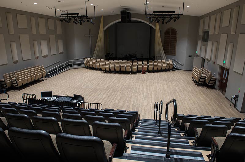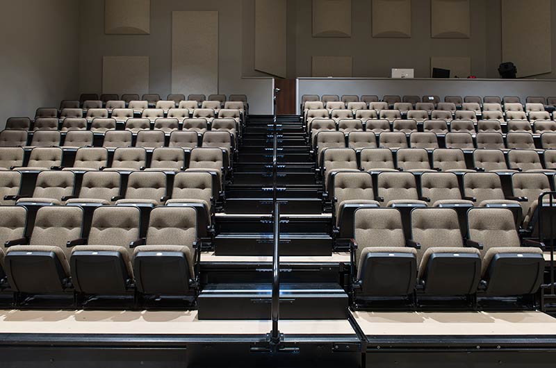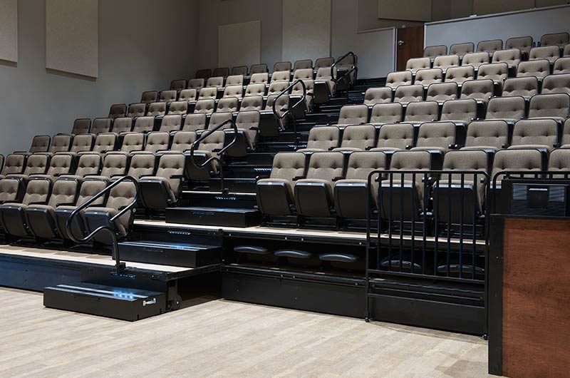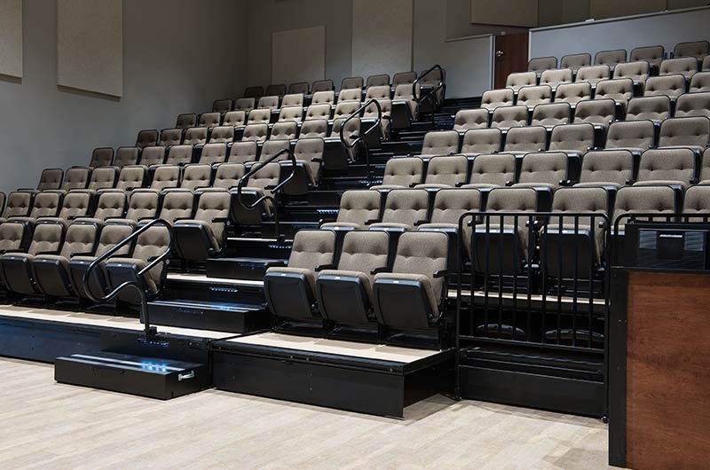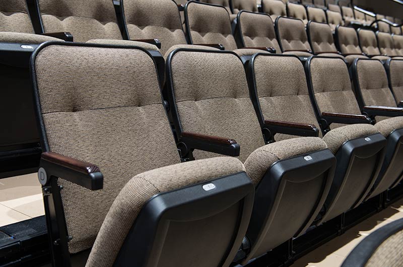 An expansion at Grace Community Church included the addition of a telescopic unit with 225 Prestige forward-fold Marquee chairs that helps keep their space flexible while providing additional seating for a growing congregation. The system was designed with a 15" rise and 36" row spacing. Aisles are provided with extended spacing Smart Rails and aisle lighting. The decking in 3/4" panelam and the system is supplied with a steerable IDS power system. In addition, this Prestige system includes six recoverable wheelchair spaces that can be converted to standard seating when not needed for those with mobility requirements. The fabric used for the backs and seats in Absecon Mills Shire Hopsack.