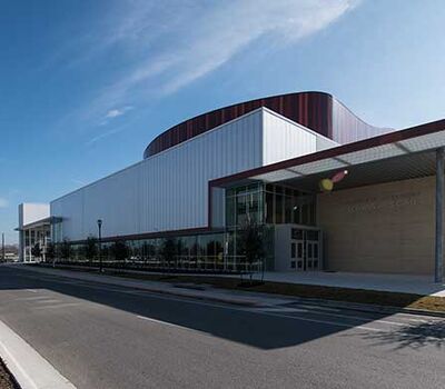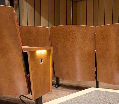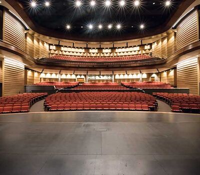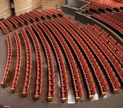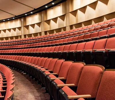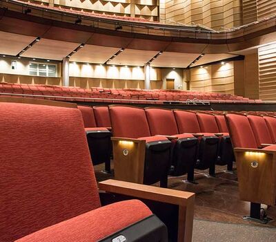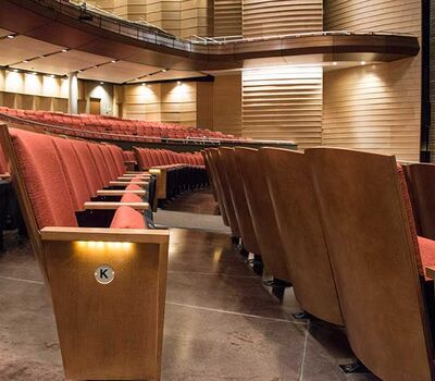 This beautiful facility opened in 2015 and serves the entire Austin ISD as well as the community which can rent the facility. The main theatre has 1,220 model 27.12.XX.8 custom Allegro chairs. The Custom ends feature concealed LED aisle lights and recessed row letter plates. The maple hardwood components are finished in No. 17 India Teak. Backs and seats are upholstered with Culp Fandango Apple fabric.