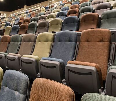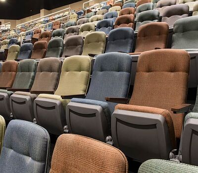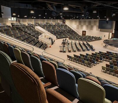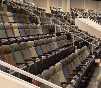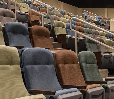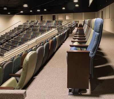 This comfortable and more engaging sanctuary has 748 model no. 89.12.60.44 Fellowship chairs provided in five colors of Designtex Bliss fabric. Backs are fully upholstered and the aisle end panels and armrests are stained in our No. 24 classic walnut on maple. The no. 44 chair platform is equipped with center flip-up center armrests.