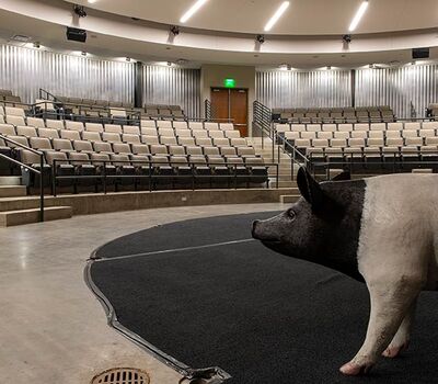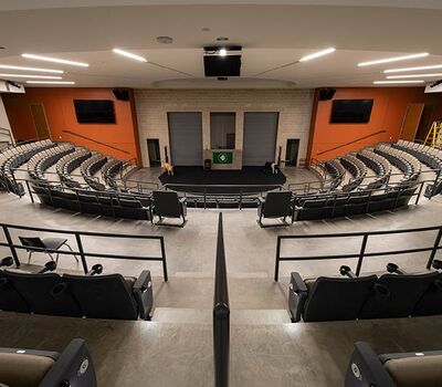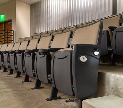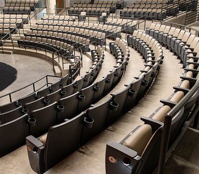 The Briscoe Carpenter Livestock Center is located on the grounds of the Texas State Fair and is used for showing and judging livestock. The showing area includes 300 model 90.12.20.4 Citation chairs from Irwin Seating Company. The seating is supplied with LED aisle lights attached to the cast iron aisle standards that feature a bevelled row letter plate landing, comfort curved polymer armrests and cupholders. The seating was finished with Charcoal Grey plastic and powder coat (paint) and upholstered with Brisa Fresco leather.