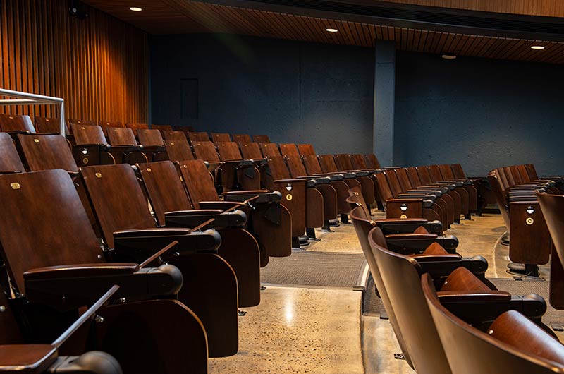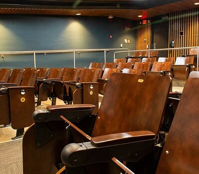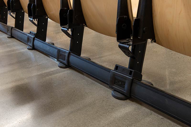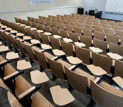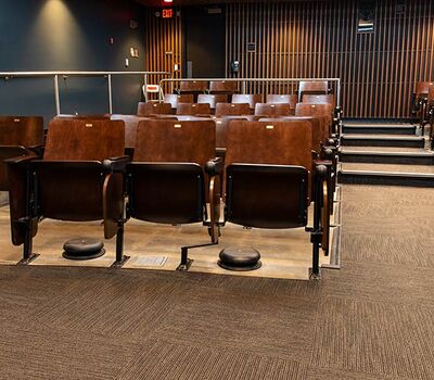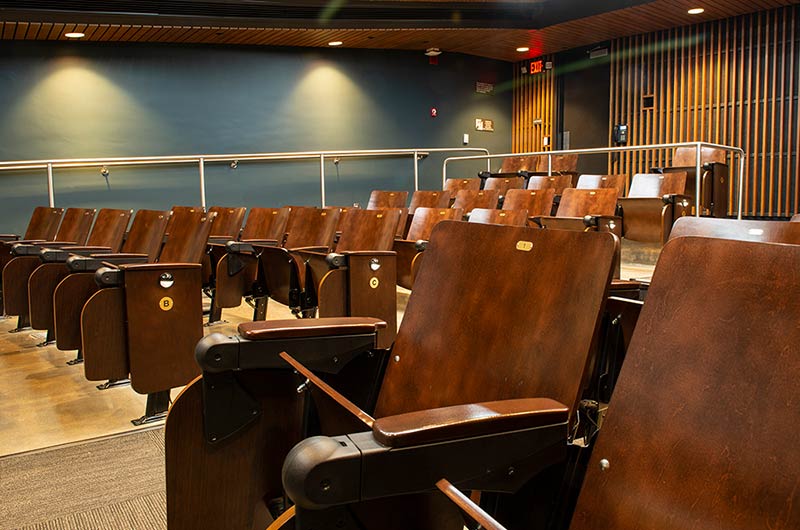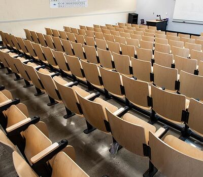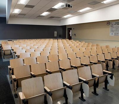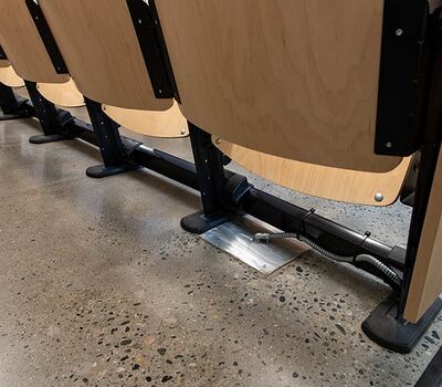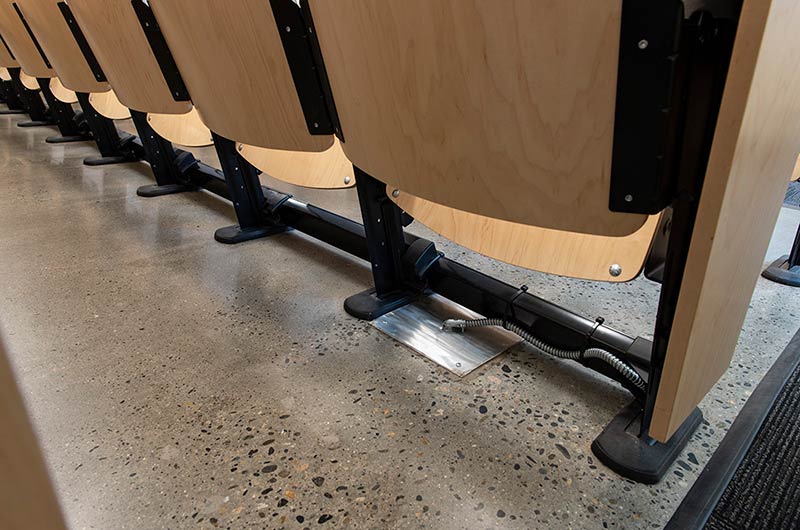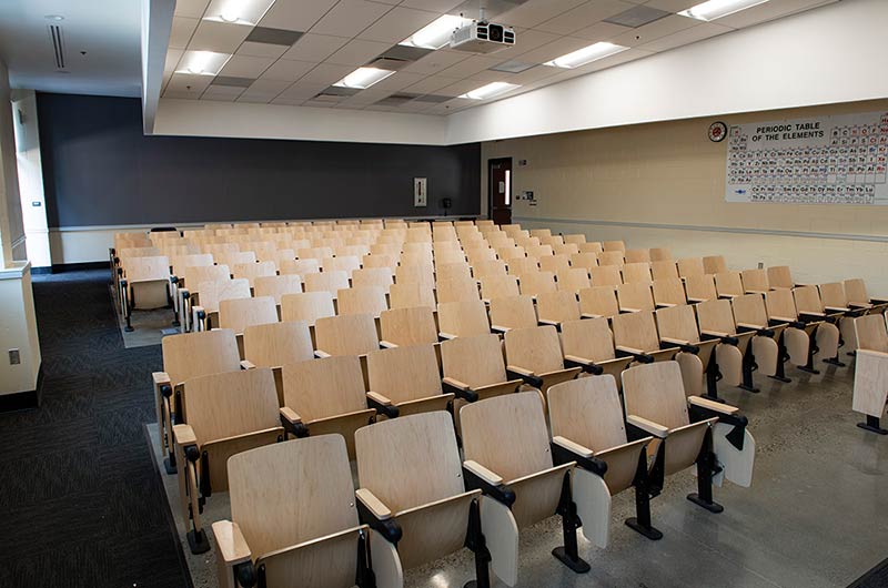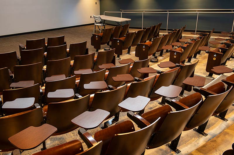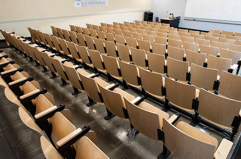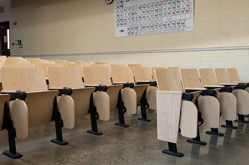 In 2018 Irwin Seating Company manufactured seating for two renovated lecture halls at Fresno State. The Conley Arts Building is installed with 87 model 1.14.56.4 Crusader chairs equipped with self-storing writing tablets, number and letter plates and LED aisle lights. These chairs are finished with black plastic and powder coat (paint), No. 24 Classic Walnut on Maple stain and Nevamar Kona Blend laminate for the writing tablets. The Science II Building is also installed with Crusader chairs (model 1.14.86.4). The 141 chairs in this room feature foot shrouds, LED aisle lights, 120 sq inch writing tablets and a couple of rows installed with the E-Link alternating 3-prong / USB power system. The seating in Science II is finished with black plastic and powder coat, No. 8 Natural on Maple wood stain and Nevamar Vermont Maple laminate.