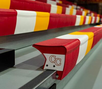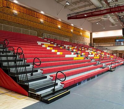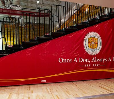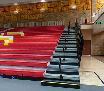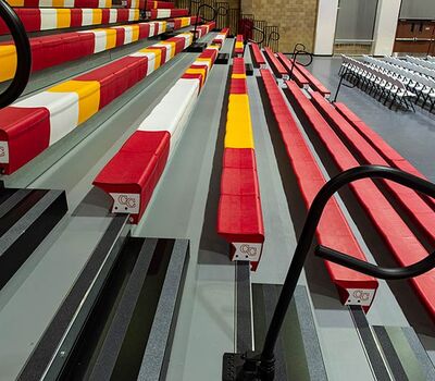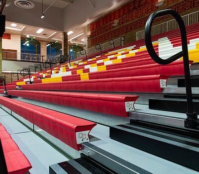 This beautiful school replaced their bleachers in 2018 with a VersaTract Telescopic System from Irwin Seating Company. The system was provided with more than 1,800 Infinity Seat Modules in three striking colors, Smart Rails and side curtains with screen printed logos on them. The day these photos were taken the gym was set up for Liturgy.