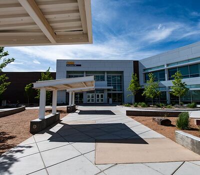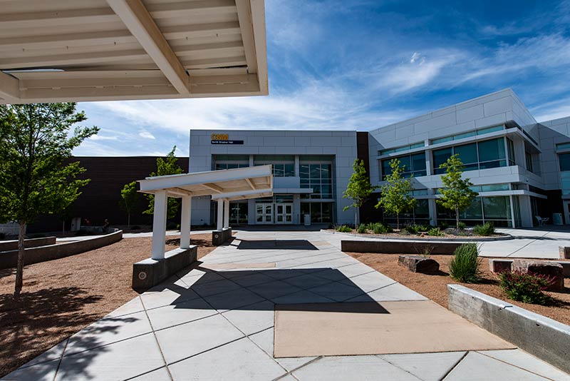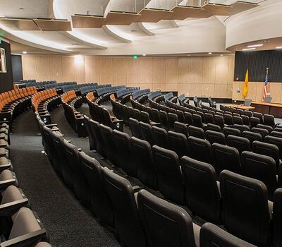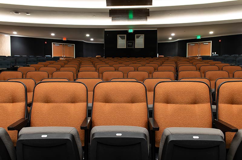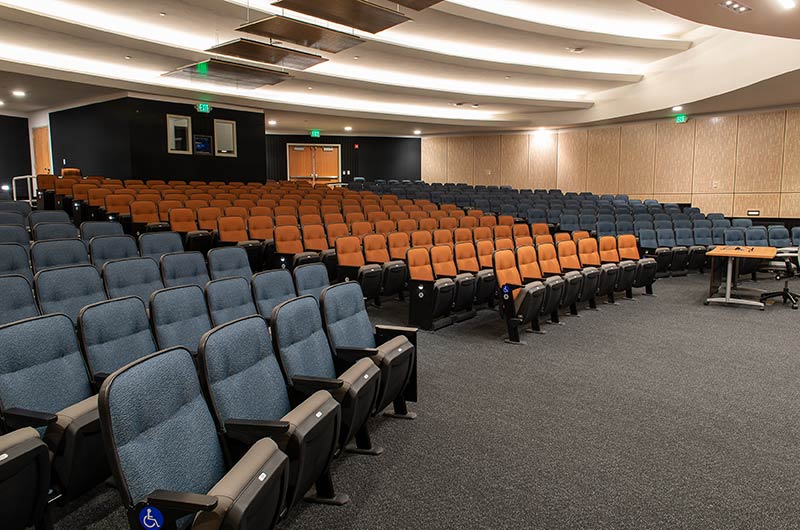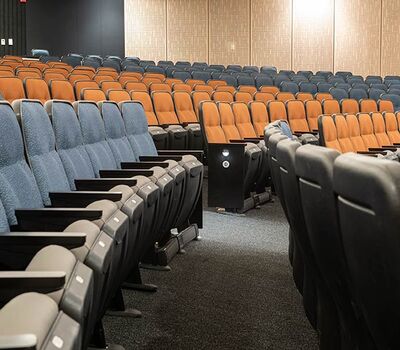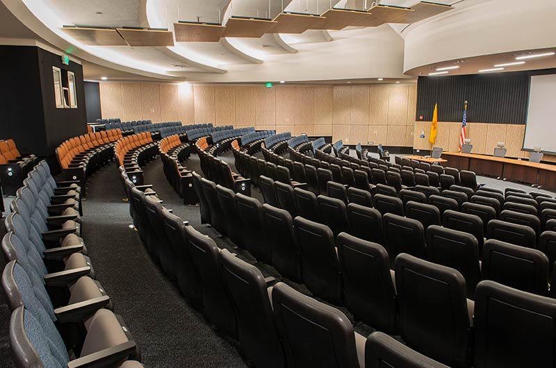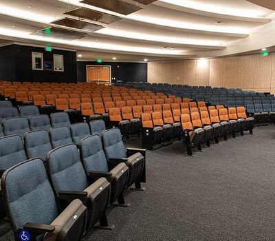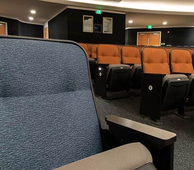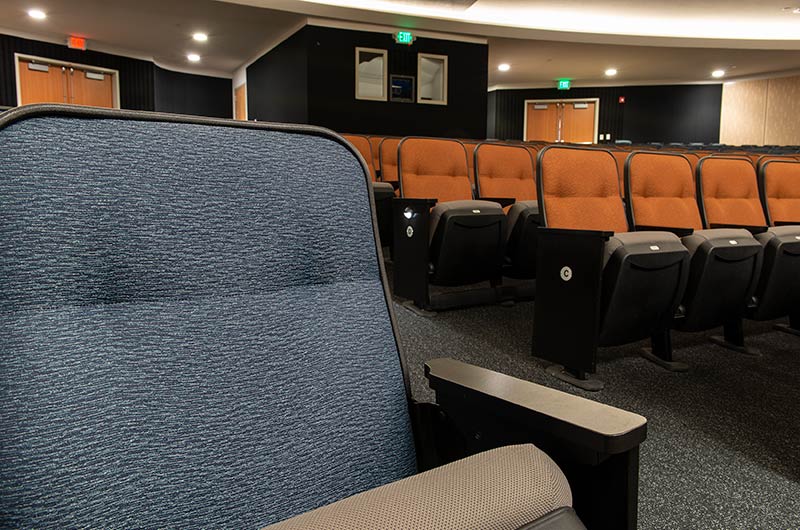 Smith Brasher Hall on Central New Mexico Community College's main campus features a 386 seat auditorium. This space is installed with Irwin Seating model 51.12.60.4 Marquee. The chairs are provided with foot shrouds, Beacon aisle lights, row letter and seat number plates and E-Link power in key locations. The chairs are finished with black plastic and powder coat (paint), No. 2 Ebony stain on maple for the solid hardwood arms and veneer surfaced aisle panels. Backs are upholstered in two colors of Momentum Fuse (Azurean & Ginger) and the seats are upholstered with Momentum Odyssey Tinge.