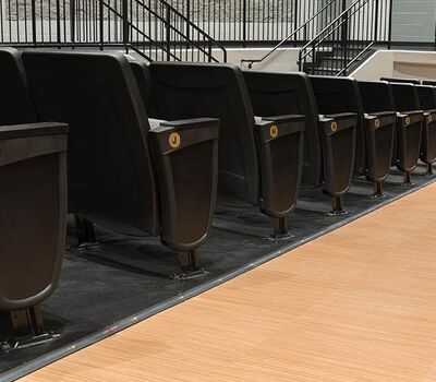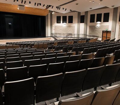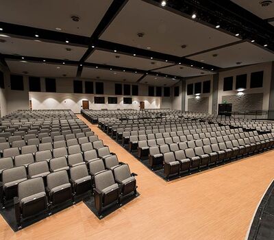 Coosa High School opened in the fall of 2016 that included a beautiful 705 seat performing arts center. The auditorium has great sightlines with the angled side banks and a perfect chair stagger for the center bank of chairs. The Irwin Seating model 90.1210.4 Citation chairs feature the No. 10 aisle end standard with a laminate surfaced insert panel and the No. 12 seat with a serpentine spring/cushion assembly for a traditional, very comfortable "ride." The chairs are finished with black plastic and powder coat (paint), the aisle insert panel is surfaced with Nevamar Jett Black laminate and the solid red oak armrests are finished in No. 2 Ebony. Backs and seats are upholstered with Absecon Mills Shire Black Marble fabric.