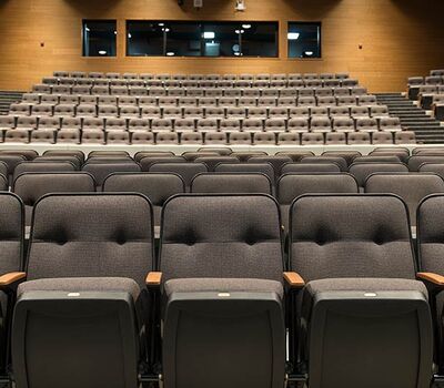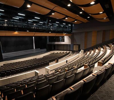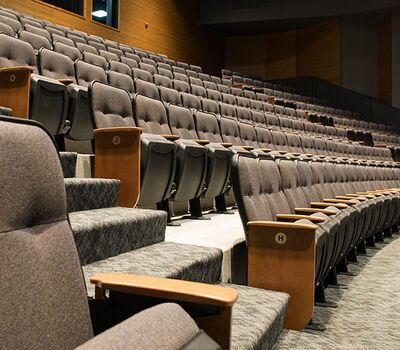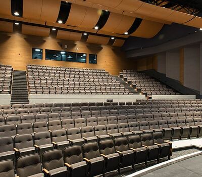 A new performing arts theatre was built for Cordova High School in 2015 and includes 457 model 51.12.66.4 Marquee chairs. The chairs are upholstered with Absecon Mills Shire Stable fabric and wood components are stained with No. 17 India Teak. Seating is provided with comfort curved wood armrests, concealed LED aisle lights, bronze number and letter plates and foot shrouds.