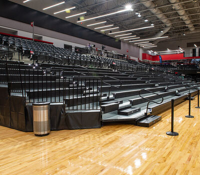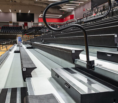 The arena is installed with Irwin Seating's Centurion stadium chair with cast iron standards that also feature cupholders and screen printed logo plates on the aisle ends. The VersaTract system was provided with Infinity Seat modules, panelam decking, Smart Rails and our 3-phase IDS power system.