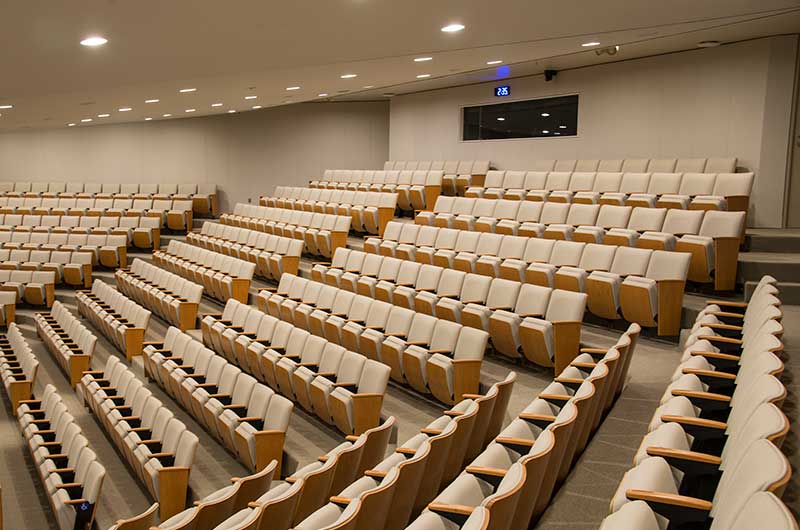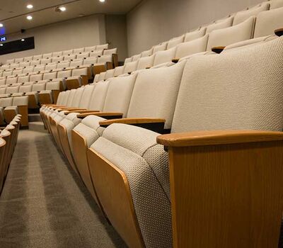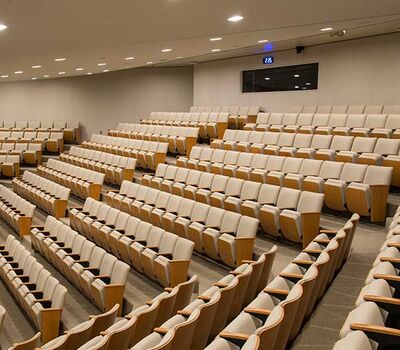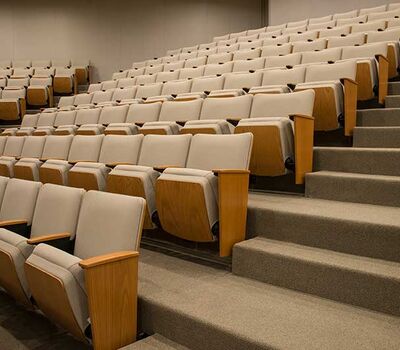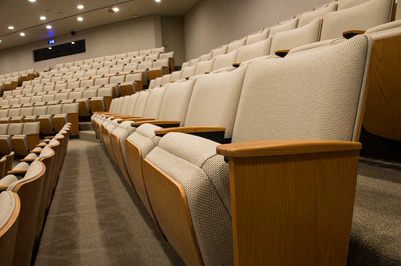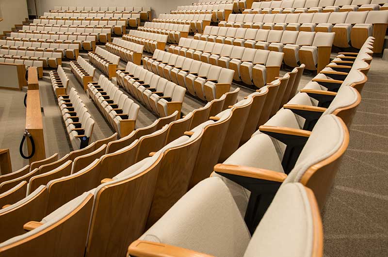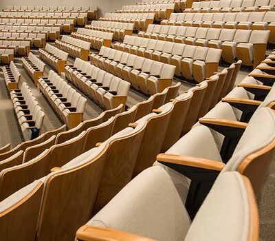 This large auditorium/lecture hall at Duke's Fuqua School of Business has 370 model 6.21.86.4 Century PAC chairs installed in it. The chairs feature veneer surfaced aisle panels and backs, comfort curved solid oak arms and the No. 21 fully upholstered seat with an optional veneer surfaced panel. The seating is finished with No. 27 Classic Golden on Red Oak stain, black powder coat and the University's own fabric.