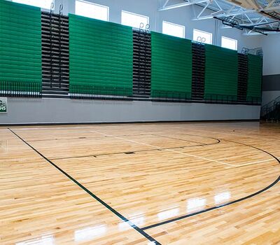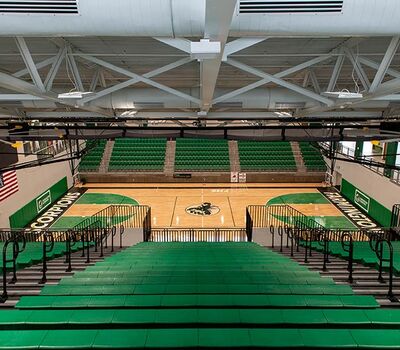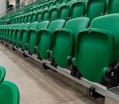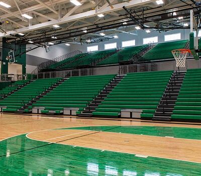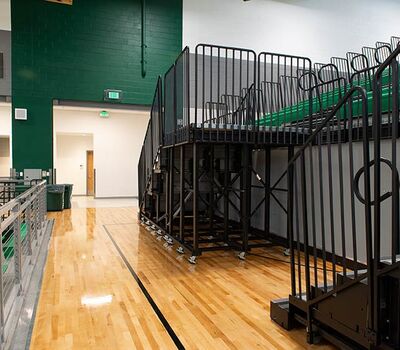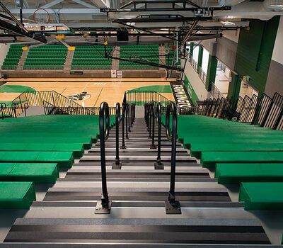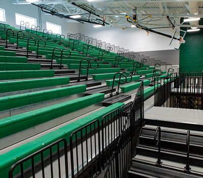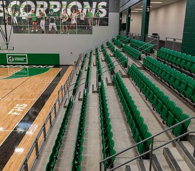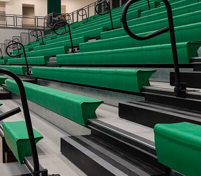 The main floor for this stunning gymnasium consists of 420 model 115.115.5.15 beam mount Solara chairs on one side and a 15-row telescopic system on the other. This group was designed with a custom row rise to meet rear row access and includes 700 Infinity Seat Modules in custom green. The balcony is equipped with a 21-row telescopic system with 900 Infinity Seat Modules. This system includes an elevated first row to ensure good sightlines of the court. To accommodate the elevation four rolling stair units were designed to provide access to the seating.