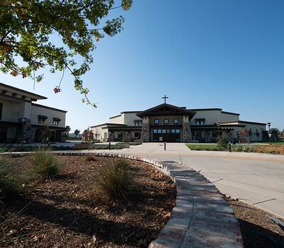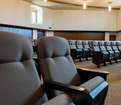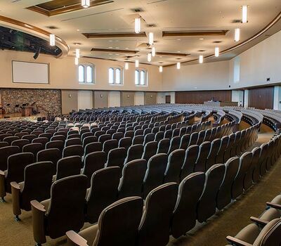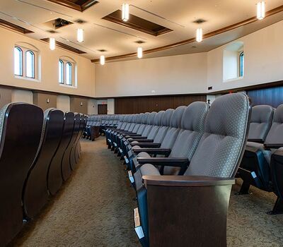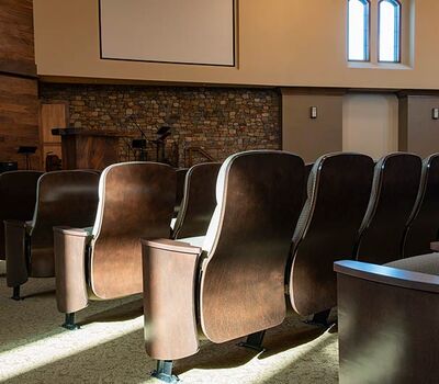 Kingsburg is located in central California's fertile farm country and is famous for its grape and raisin production. This beautiful church is installed with close to 1,100 model 89.12.34.44 Fellowship chairs. These chairs feature gorgeous compound curved wood backs, under-seat book boxes and center armrests that flip-up to next between the backs. Finished with black plastic and powder coat, the Maple backs and arms are stained with No. 24 Classic Walnut and the upholstery is Absecon Mills Paragon Putty.