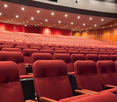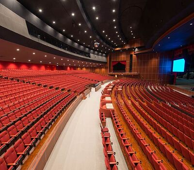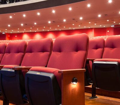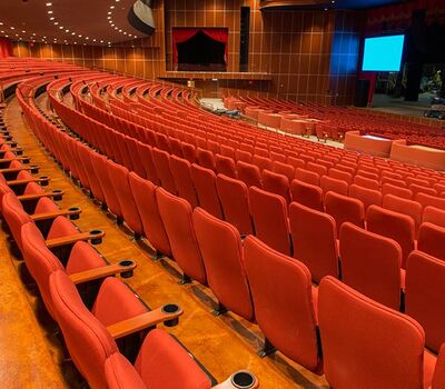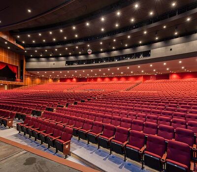 A $10 million dollar renovation to the Grand Theatre at the Grand Sierra Resort and Casino included 2,600+ 53.12.66.8 Marquee chairs. The backs are fully upholstered with Guilford of Maine Open House Poppy fabric. The seating is provided with veneer surfaced aisle end panels with Focal LED aisle lights and wood cupholder armrests.