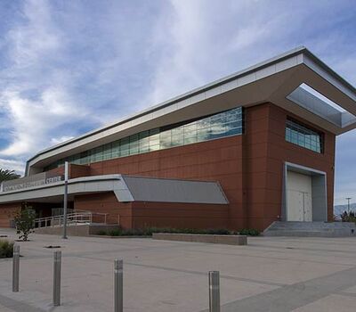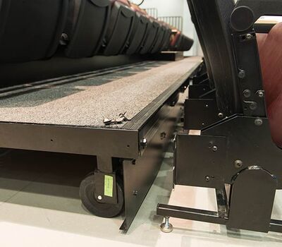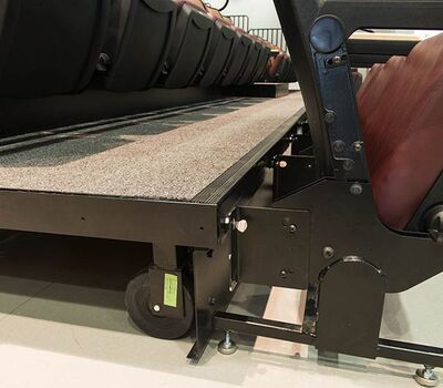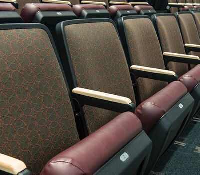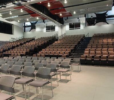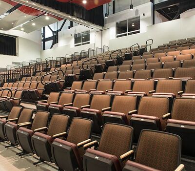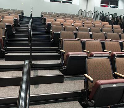 This unique facility was designed for California weather in mind, the stage can be used indoors or out! The indoor auditorium has a Prestige telescopic system designed with an 11" rise and 36" row spacing. Aisles are provided with extended spacing Smart Rails. The decking is carpeted in commercial-grade carpeting and the system is supplied with our IDS power system. In addition, this Prestige system includes first-row seating that is removable for wheelchair spaces. The fabric used is Maharam Chime for the seats and Maharam Plait for the backs.