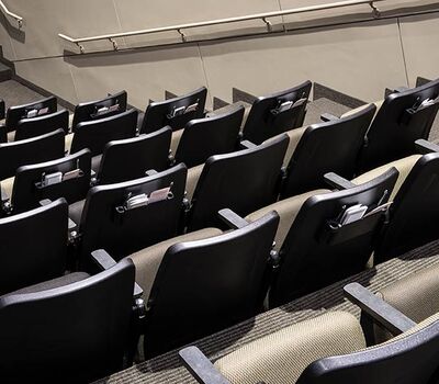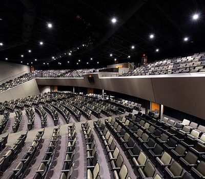 An expansion to the worship center in 2017 included 1,200 model 90.12.10.44 Citation chairs from Irwin Seating Company. These chairs feature flip-up center armrests, our No. 12 self-rising seat, and rear-mount envelope holders. The seating was supplied in three colors of Absecon Mills Icon fabric. Armrests and the aisle insert panel were surfaced with Nevamar Rush laminate.