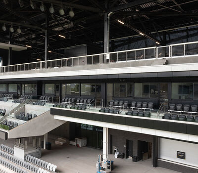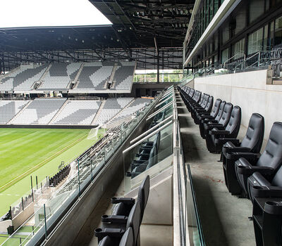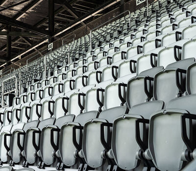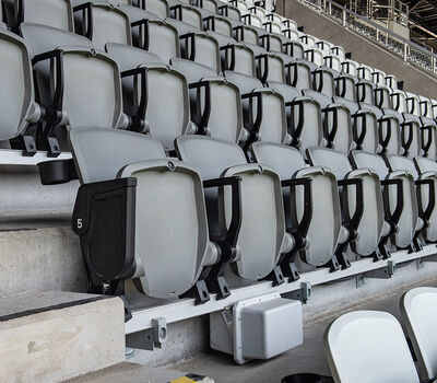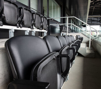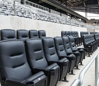 The majority of the seating are beam-mount Solara chairs with rear mounted cupholders. The seating was supplied in two shades of grey and installed in angular / geometric patterns. Club and suite areas are installed with wider, padded and upholstered Solaras or Irwin Seating's premium Signature chairs.