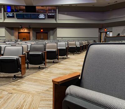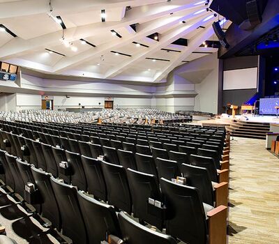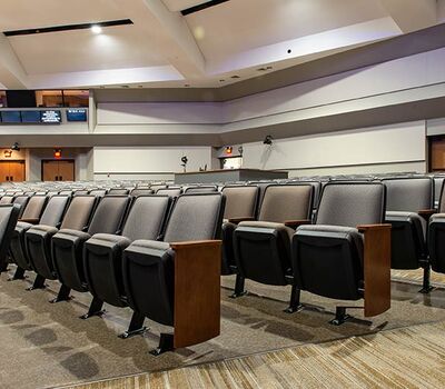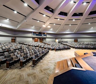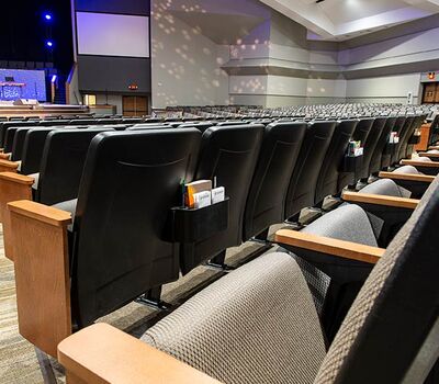 The beautiful campus of Mobberly Baptist Church includes a sanctuary with 1,186 models 90.12.17.4 & 90.12.17.44 Citation theater-style seating from Irwin Seating Company. These chairs are 100% manufactured in the United States with flip-up armrests and book boxes/envelope holders. The seating is finished with black plastic and powder coat (paint), No. 17 India Teak stain for the maple armrests and aisle panels and three colors of Absecon Mills Primary fabric.