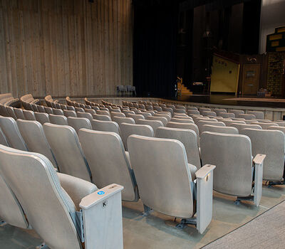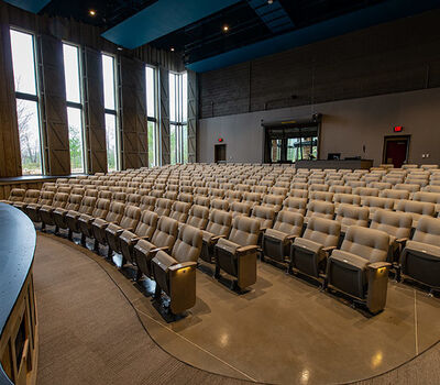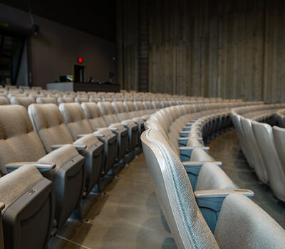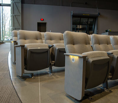 Northern Sky Theatre has operated an outdoor venue in beautiful Door County, Wisconsin since the early 70's. During that time the the troupe has written and performed a number of renowned musical comedies that highlight life in the Upper Midwest. With the desire to provide entertainment year round the Theatre opened the Creative Center in 2019. The Center includes gathering spaces, an art gallery and the 246 seat Barbara & Spencer Gould Theatre. Irwin Seating was privileged to provide model 52.12.56.4 Marquee chairs for this state of the art space. The seating features cantilevered aisle end panels, comfort curved hard wood arms, No. 12 seats with a loge cushion, concealed LED aisle lights and donor plates. The wood back Marquee chairs are finished in a custom wood stain on Maple, plastic and powder coat (paint) are Cadet Grey and the fabric is C.F. Stinson, Bali, Moonstone. The result is stunning!