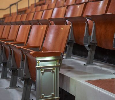Ramsey Middle School is a 6 - 8 grade school in the Minneapolis Public School System. In 2015 the auditorium seating was replaced with model No. 1.14.163.4 Crusader theatre chairs. The cast aluminum aisle end standards and wood back and seats fit the decor of this grand old building beautifully. Steel components were powder coated in Cadet Grey and the Maple backs, seats and armrests were stained with our No. 29 cherry.