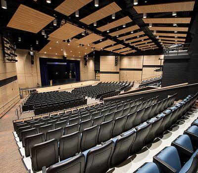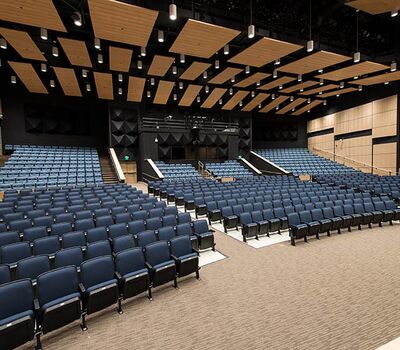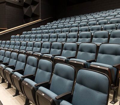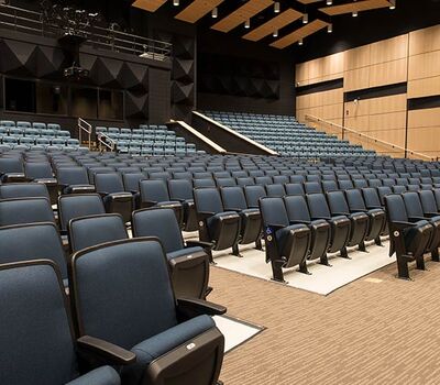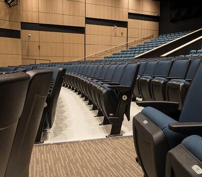 This attractive auditorium bridges the Scituate High and Middle Schools. In addition to that unique feature, two fixed seating models were supplied by Irwin Seating Company. The sloped floor area is installed with 90.12.00.4 Citation while the stepped riser area is installed with Marquee chairs. Both models are finished with black plastic and powder coat and they are upholstered in two different Maharam Messenger fabric colors.