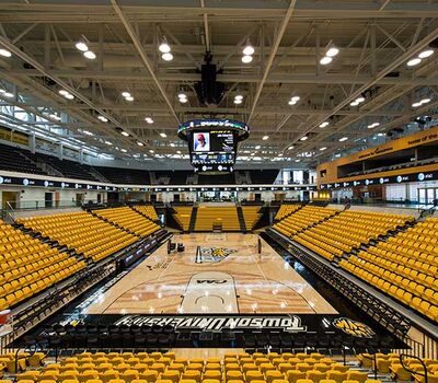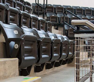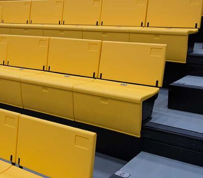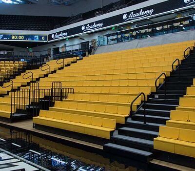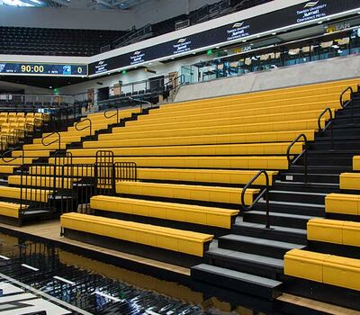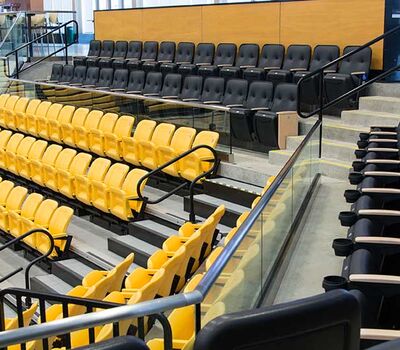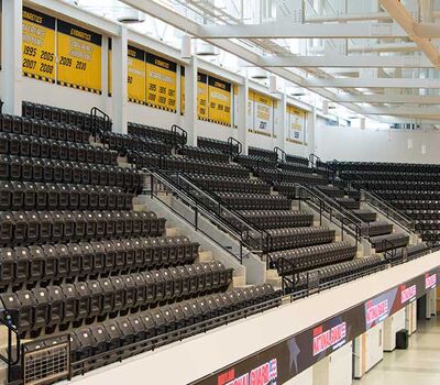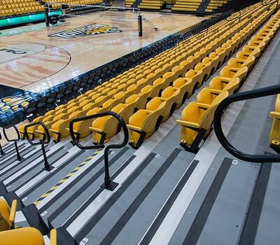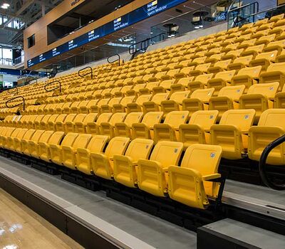 SECU Arena at Towson University is a 5,200-seat venue for athletics, sporting events, concerts, commencements and more. Four Tiger athletics teams compete in the new facility, including men’s and women’s basketball, volleyball and gymnastics. The arena opened in fall 2013 and was awarded LEED Gold certification for energy use, lighting, water and material use, in addition to a variety of other sustainable features. The upper bowl is installed with model 30.52.00.30 patriot, Club seating has 51.12.66.4 Marquee and the lower bowl sidelines has Prestige telescopic platforms with forward fold Patriot chairs. One baseline has model 4500 telescopic bleachers with blow mold seat modules and folding backrests.