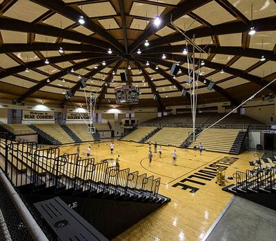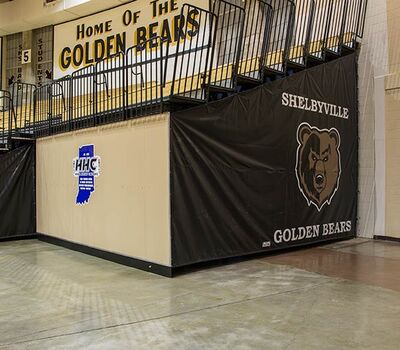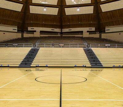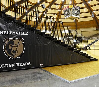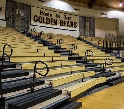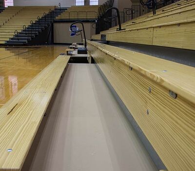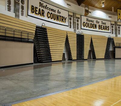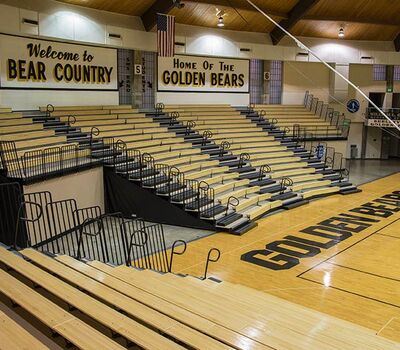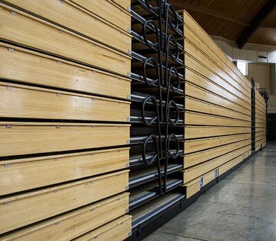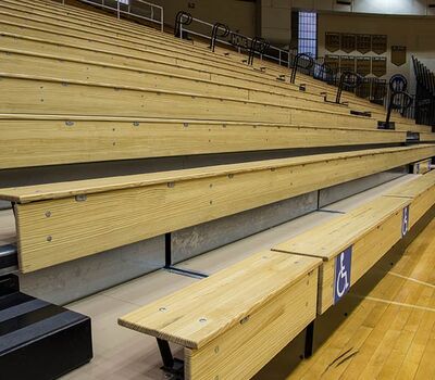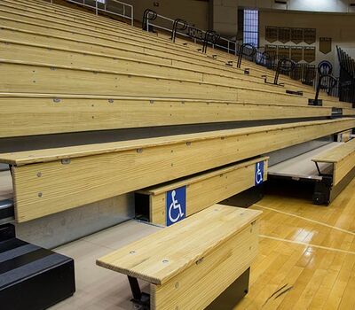 Model 4500 telescopic bleachers with wood bench seating, smart rails, panelled, screen printed vinyl end curtains, self-storing end rails and ADA recoverable wheelchair spaces. End court bleachers are provided in tapered sections. The units are provided with 208/230 VAC IDS power supply with steerable control.