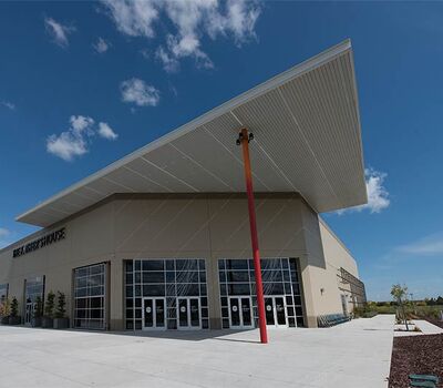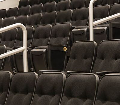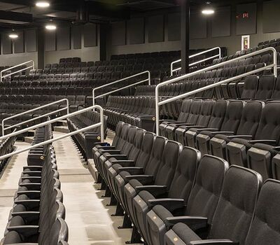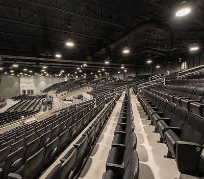 A beautiful campus in a beautiful location, The Father's House fixed seating is model 51.12.10.4 Marquee. These chairs are upholstered in Absecon Mills Sherpa black fabric. The seating is provided with comfort curved polymer armrests and Caddy envelope holders.