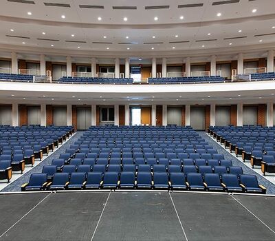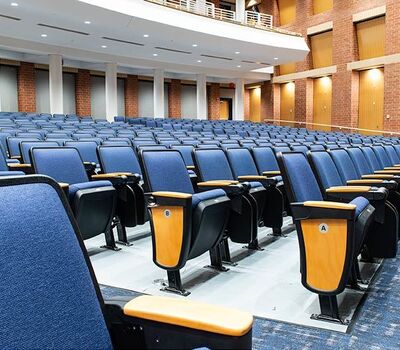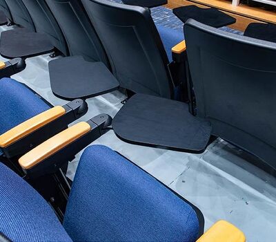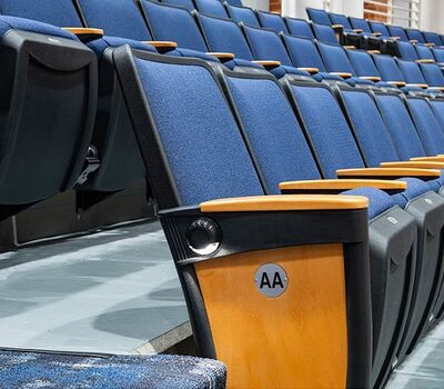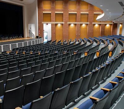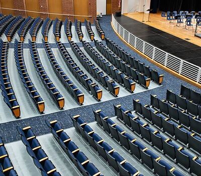 During Summer break of 2018 Tift County High School's performing arts center was re-seated with 800 new Citation chairs from Irwin Seating Company. The seating was provided with No. 12 seats, the No. 10 aisle standard with a veneer insert panel and Focal LED aisle lights. Also furnished were comfort curved solid hardwood arms, 120 square inch writing tablets, seat number/row letter plates and movable bases that provide wheelchair spaces when needed. Plastic and steel were supplied in black, Maple wood components were finished in No. 27 classic golden and the chairs were upholstered with Absecon Mills, Shire, Delft Blue fabric.