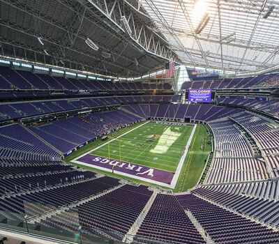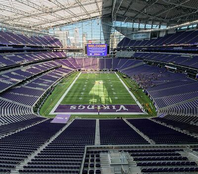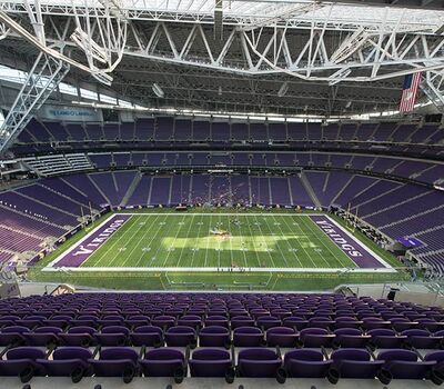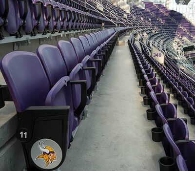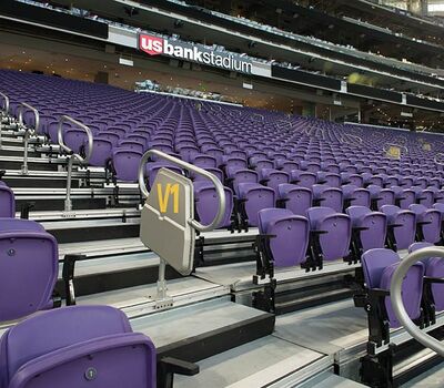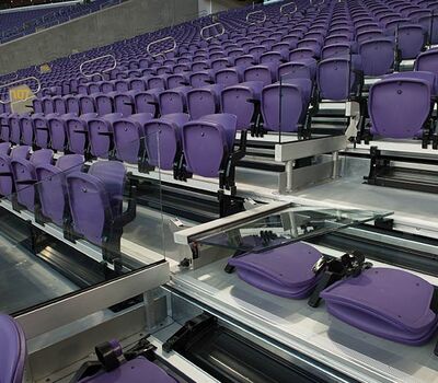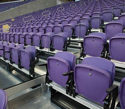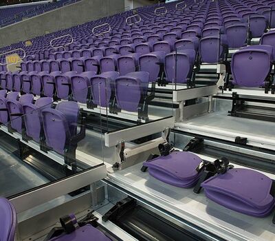 U.S. Bank Stadium has a capacity of more than 66,000. The stadium features the largest transparent roof in the United States, the largest set of pivoting glass doors in the World and one of the largest telescopic seating systems ever manufactured! Seating areas are differentiated from one another with four separate models from Irwin Seating Company. The Suites are installed with model 72.12.90.4 Signature, the General and Club areas are outfitted with beam-mount Solara chairs while the Club sections feature padded and upholstered versions. The custom telescopic unit was engineered and built to provide patrons with a deck that feels as solid as the chairs installed on concrete. The system also features some operational advantages that include semi-automatic chair operation, folding glass partitions that divide club areas, quick-release front rails/aisle handrails and a unique in-floor alignment system that ensures proper tracking while opening or closing the unit. The last two rows of the system are provided with a hinged deck that allows the massive 35-row system to store completely beneath the concrete.