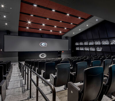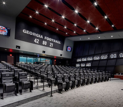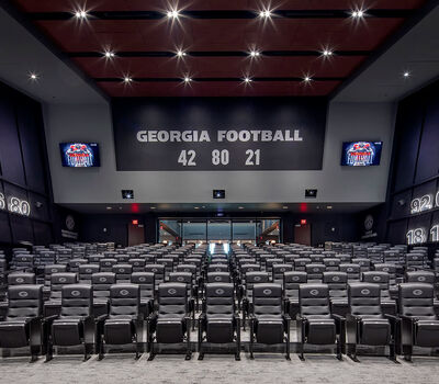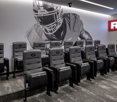 Those meeting rooms are installed with Film Room Signature chairs from Irwin Seating. These chairs are designed for athletes who require more room and height than most of us need. Backs and seats are upholstered with Illusion Vinyl and include the Georgia logo embroidered on the backs.