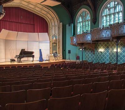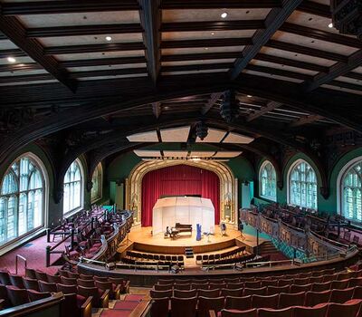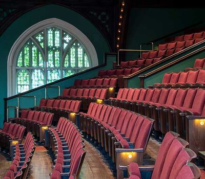Mandel Hall’s rich Victorian interior includes seating for 878 audience members, an ornate balcony, majestic windows (including one made by Tiffany & Co. given to the University by the class of 1902), and detailed oak woodwork. Mandel Hall recently underwent a major renovation that finished in January 2013, which focused on improving the interior of the theatre and included new seating from Irwin Seating Company.