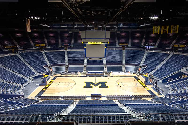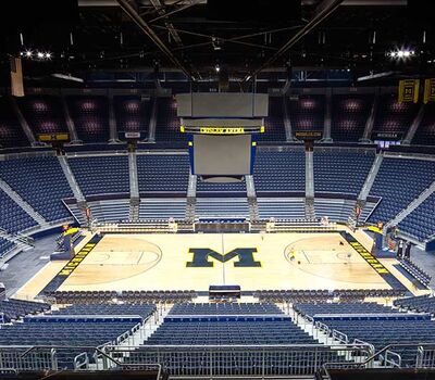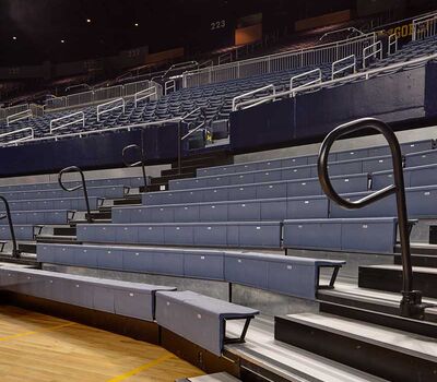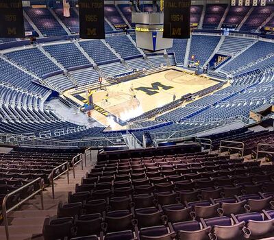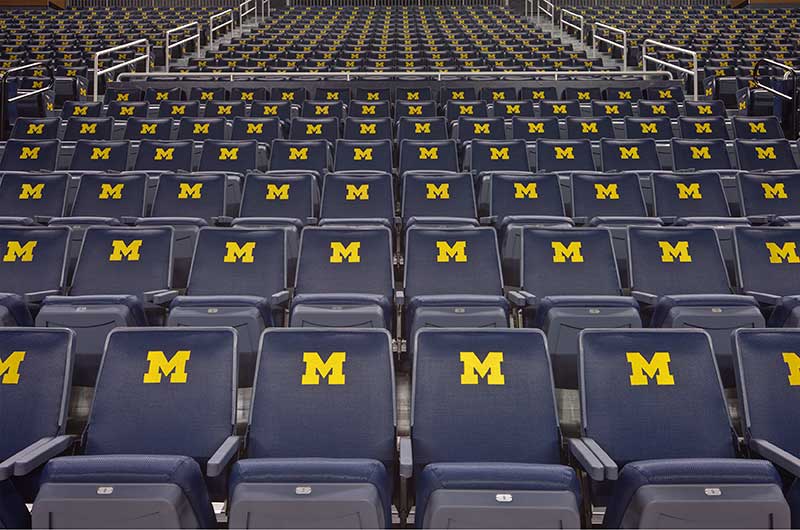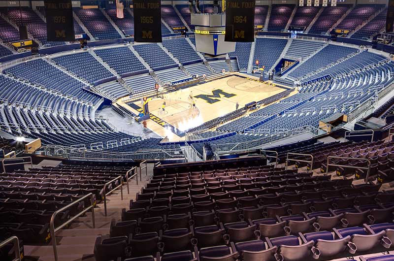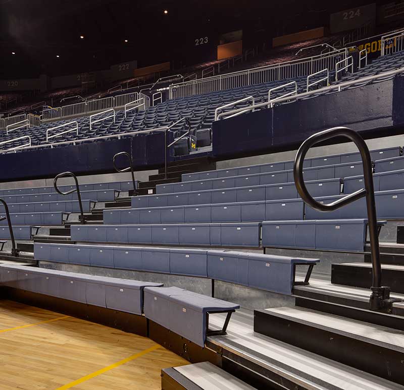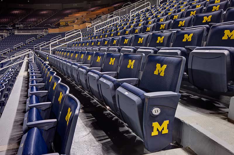 Crisler Arena opened in 1969 and is the name for Fritz Crisler for his enduring contributions to Michigan athletics. In 2011 a major renovation to the arena included a slight name change to the Crisler Center as well as new telescopic equipment and fixed seating from Irwin Seating Company. Telescopic systems include model 4500 bleachers with plastic seat modules and model 5000 bleachers with nose mount Citation chairs. The fixed seating provided is model 4.12.20.4 Citation chairs. Club seating is provided with embroidered backs.