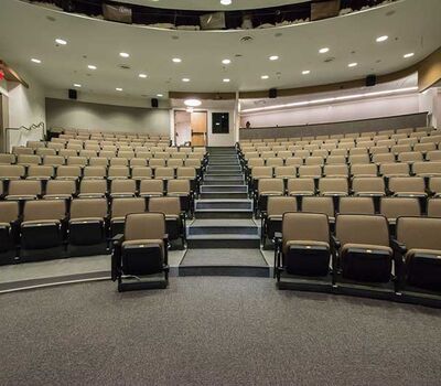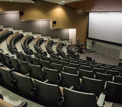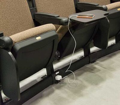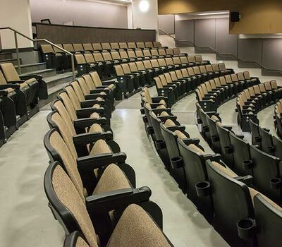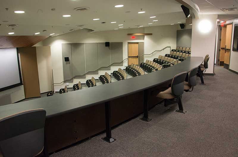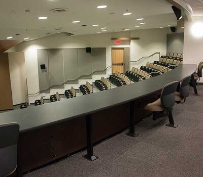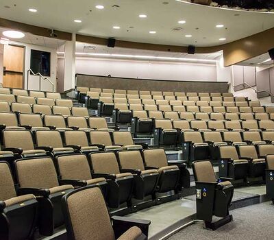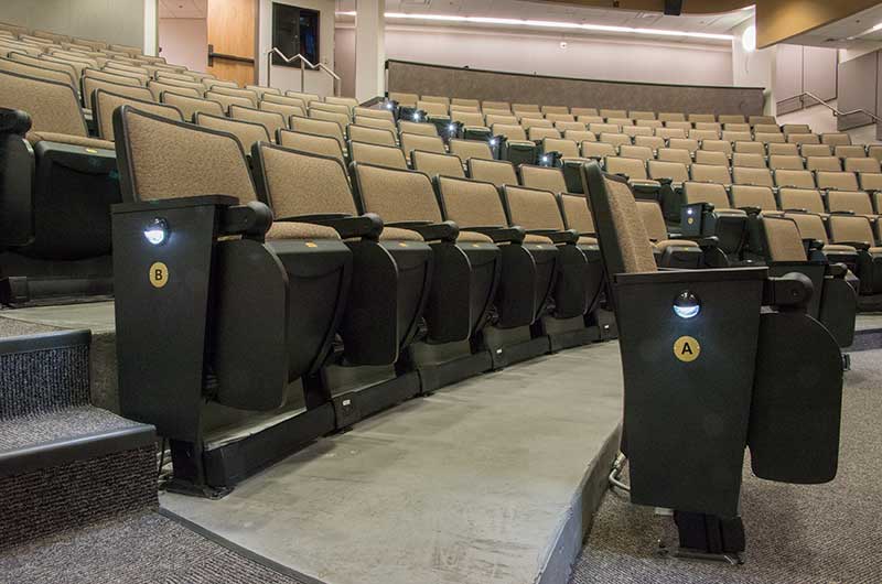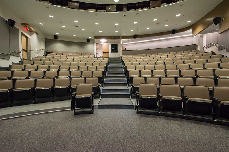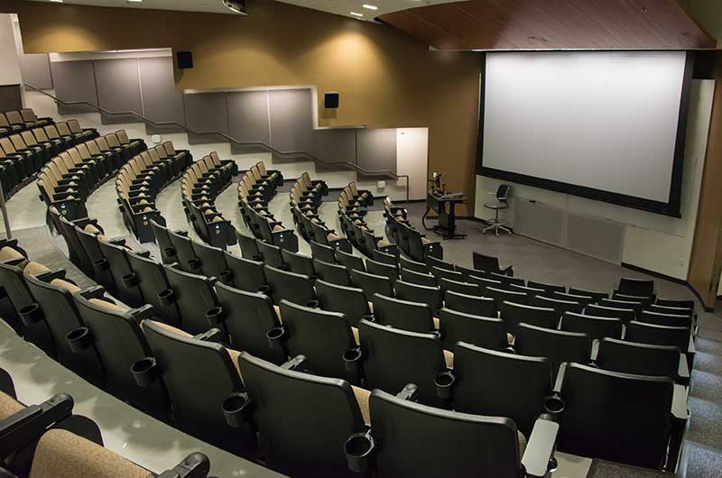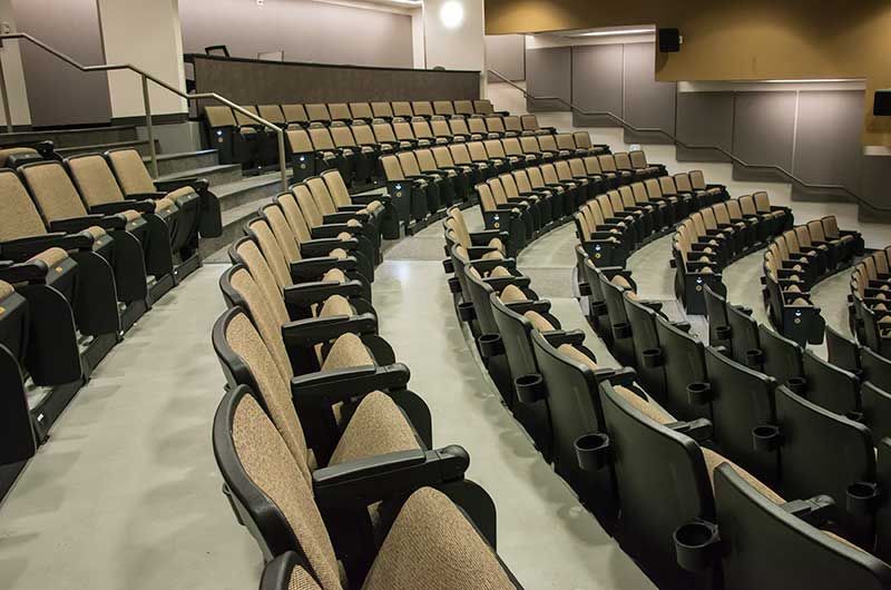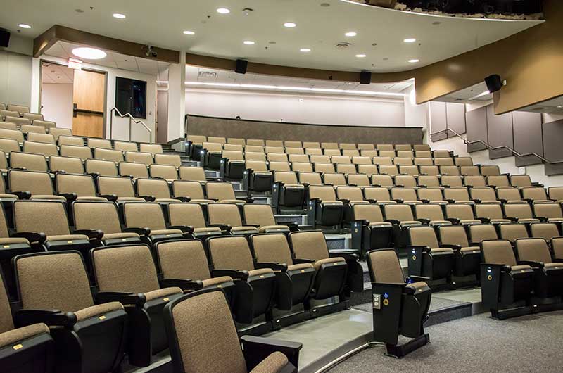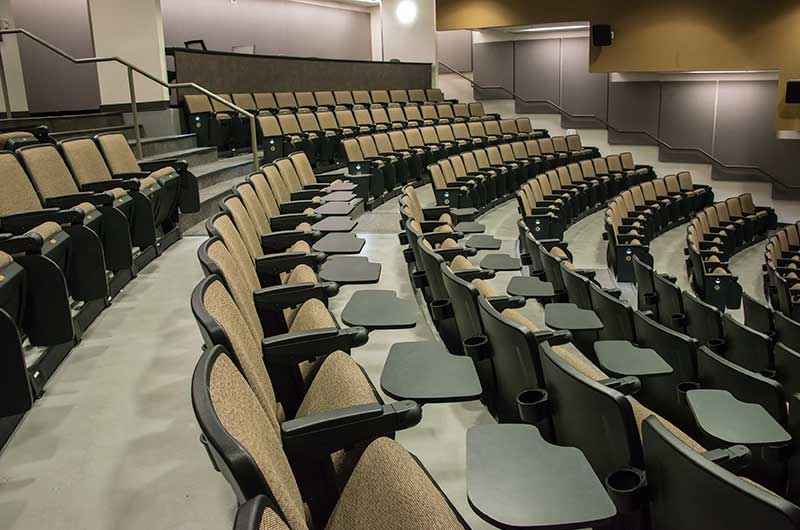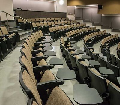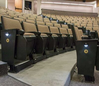 The University of Texas, Moody College of Communication CMA Building has a number of lecture rooms installed with 90.12.86.4 Citation chairs. The room shown here seats 200 students. The seating is equipped with 120 sq. inch writing tablets and the E-Link system to provide 120v power to each chair. Aisle panels, armrests and writing tablets are surfaced in Nevamar Charcoal Matrix laminate and the seating is upholstered in Absecon Mills, Shire, Hopsack fabric. The room is also installed with model 24.67 Uni-Lecta tables in the back of the room.