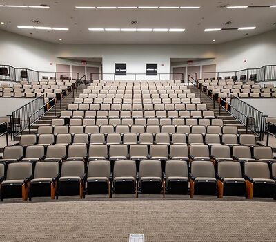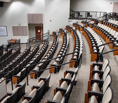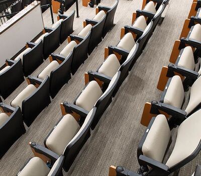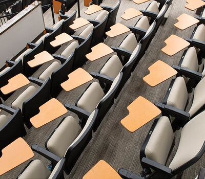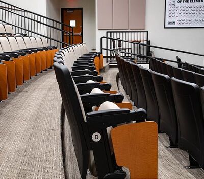 Bailey Science Center includes two large lecture halls with model 90.12.00.4 Citation chairs. These chairs are provided with a custom shaped, 138-square inch writing tablet surfaced with Nevamar Caramel Sagawood. These Citation chairs were also supplied with row letter and seat number plates (clear aluminum) and comfort curved polymer armrests. The upholstery fabric selected for this project is Momentum, Odyssey, Linen.