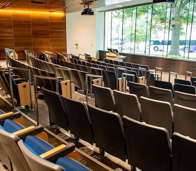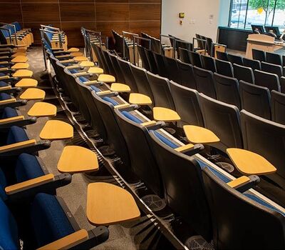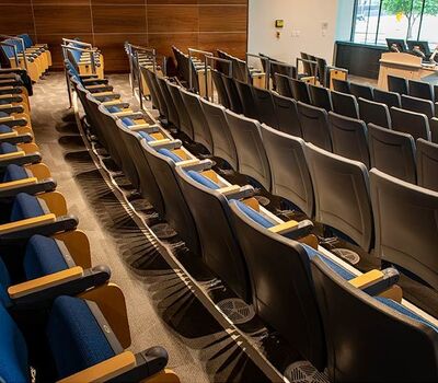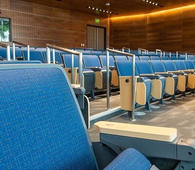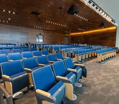 Virginia Commonwealth University's new College of Health Professions is set to open for the 2019 Fall semester. This building includes a beautiful 157 seat auditorium with Model 90.12.86.4 Citation from Irwin Seating Company. The seating was provided with 120 square inch writing tablets and LED aisle lights. Armrests, aisle panels and writing tablets are surfaced with Nevamar Clear Maple laminate, plastic and powder coat is Charcoal Grey and the fabric selected is Guilford of Maine, Couture, Tailor.