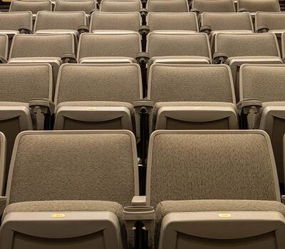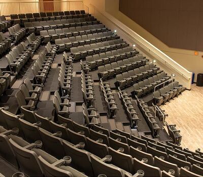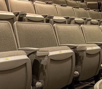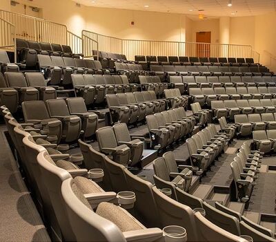 This 273 seat auditorium in Virginia Commonwealth University's Student Commons Building was upgraded in 2019 with Irwin Seating Citation chairs. Model 90.12.00.4 shown here was provided with comfort curved polymer arms, cupholders, LED aisle lights and contemporary "open" aisle end standards. The chairs are finished with black powder coat (paint), Cadet Grey plastic and Absecon Mills, Shire, Aqueduct fabric.