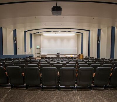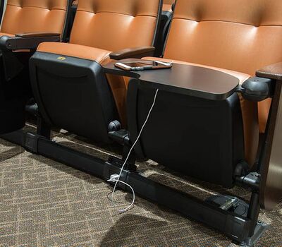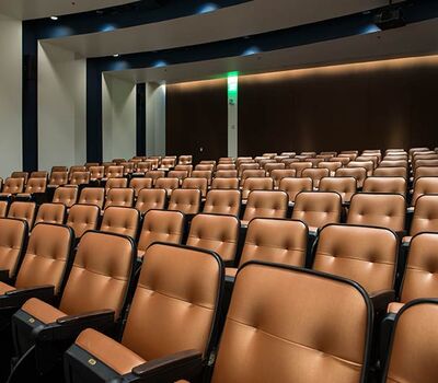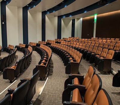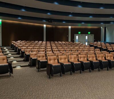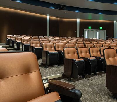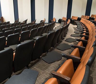 The new Applied Science Building at Venutua College was built with a large 204 seat lecture hall. Model 51.12.66.4 Marquee chairs were provided with a mix of 21" - 24" wide chairs and extra-large 151 square inch writing tablets. Irwin Seating's E-Link power/data system was also installed. Seating is finished in black plastic and powder coat, No. 24 Walnut on Red Oak stain for comfort curved arm and aisle end panels. The chairs are upholstered with Designtex Metta Ginger fabric.