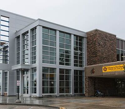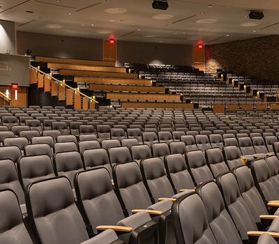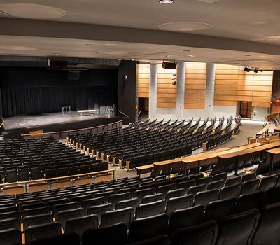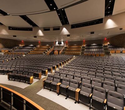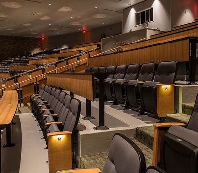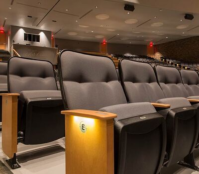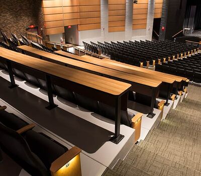 The West Bend East and West High Schools share a campus and a large auditorium with 1,068 model no. 51.12.66.4 chairs and 12 strip tables provided by Irwin Seating Company. Chairs are upholstered with Designtex Wren Slate fabric. Other finishes include a custom wood stain on Maple, black plastic & powder coat (paint) and Formica Planked Deluxe Pear laminate.