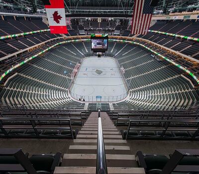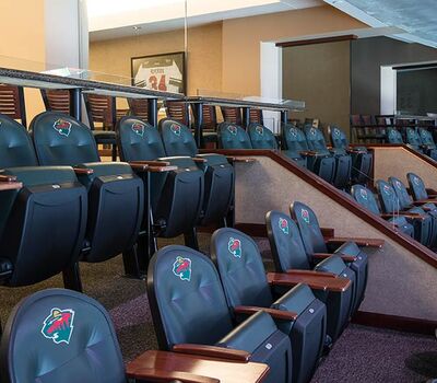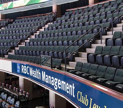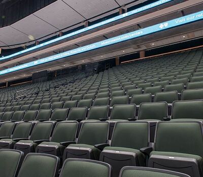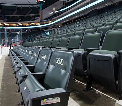 A 2016 renovation to the Xcel Energy Center included replacement of all 18,000 chairs in the arena. General seating sections are installed with model No. 90.12.20.4 Citation chairs. These areas feature our No. 20 cast iron aisle panel with bevelled row letter plate and a custom logo plate. Club areas are provided with tufted backs and our No. 12 loge seat with 4" foam. The Audi on the Glass club area is provided with embroidered logos. Suites are installed with Model 91.12.66.4 Millennium chairs with team logo embroidered on the backs, the No. 12 loge seat, comfort-curved wood arms and intermediate drink tables.