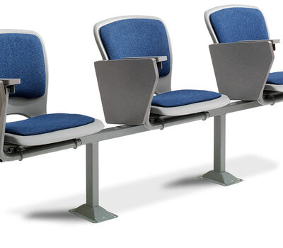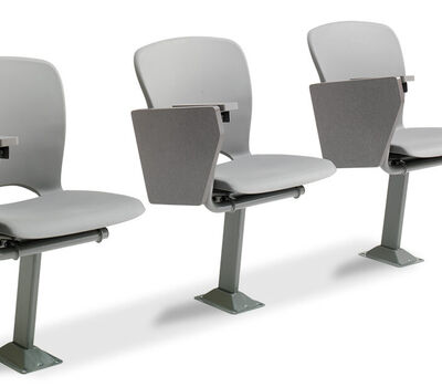 The No. 7.71 chair is designed with a padded & upholstered, one-piece polymer shell (No. 7) and a large self-storing writing tablet. It is available for floor mounting, riser mounting, and on a horizontal steel beam (floor mount only).